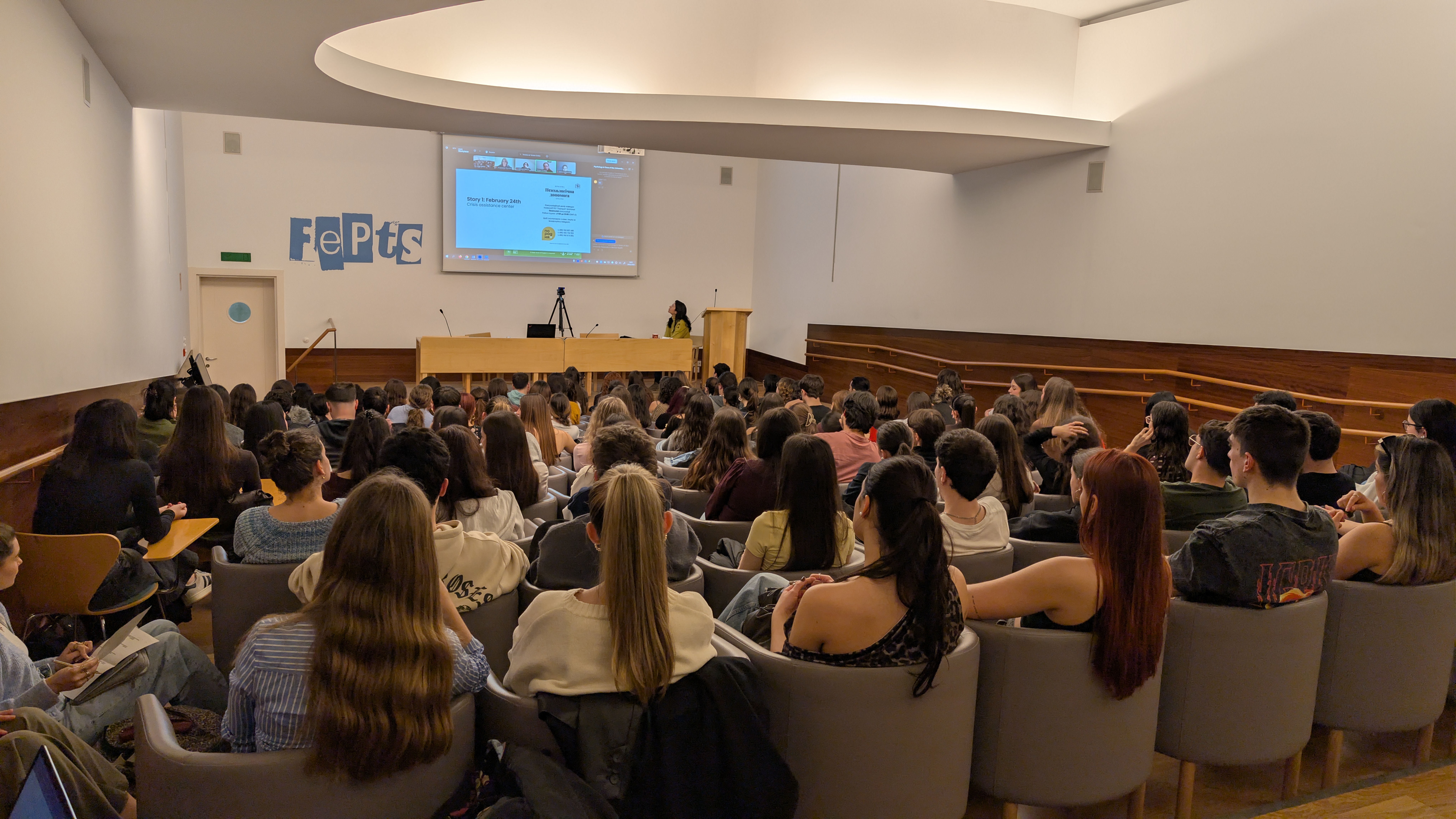 La sessió ha estat presentada i moderada per Silvia Cavalcante, responsable de l’organització acadèmica internacional de la facultat, que ha facilitat l’intercanvi entre les dues universitats. Des de Lviv han participat la Dra. Anastasiia Shyroka, professora associada del Departament de Psicologia i Psicoteràpia, i Tetiana Tymkiv, administradora del centre psicològic universitari Poradnya, juntament amb altres voluntaris i estudiants implicats en el programa.